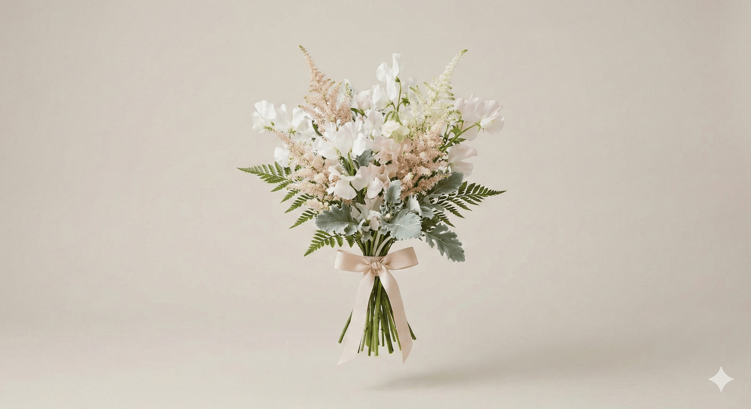 Ideally sized for bridesmaids. This posy is light and airy, featuring the sweet fragrance of pastel sweet peas and the feathery texture of astilbe. Tied with a simple ribbon, it complements the bridal bouquet perfectly without competing with it.