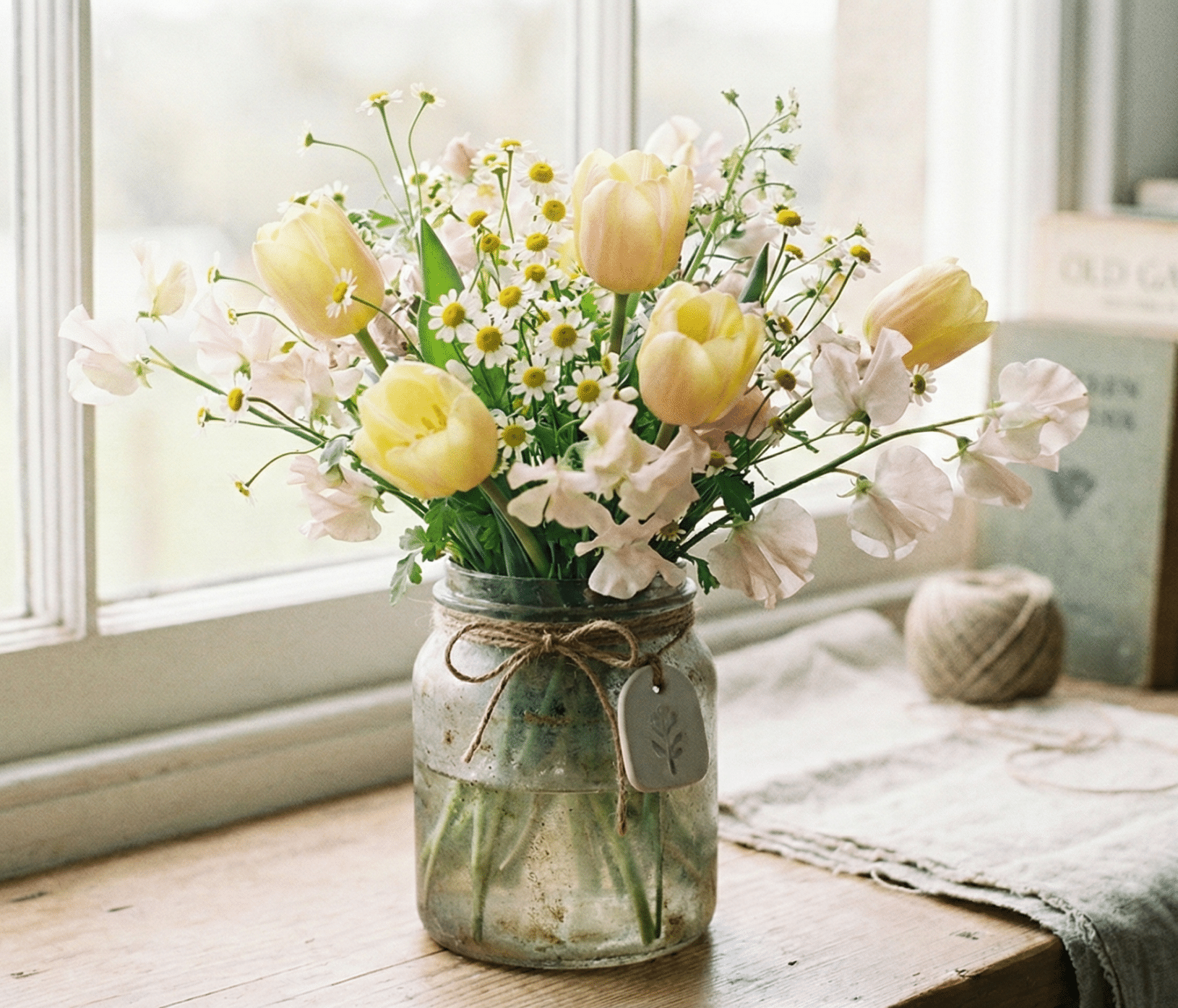 Embrace the charm of the English countryside. Meadow Sunshine is a loose, organic arrangement where soft pastel yellow tulips dance alongside delicate white chamomile daisies and sweet peas. It feels freshly picked from a garden—airy, light, and full of joy.