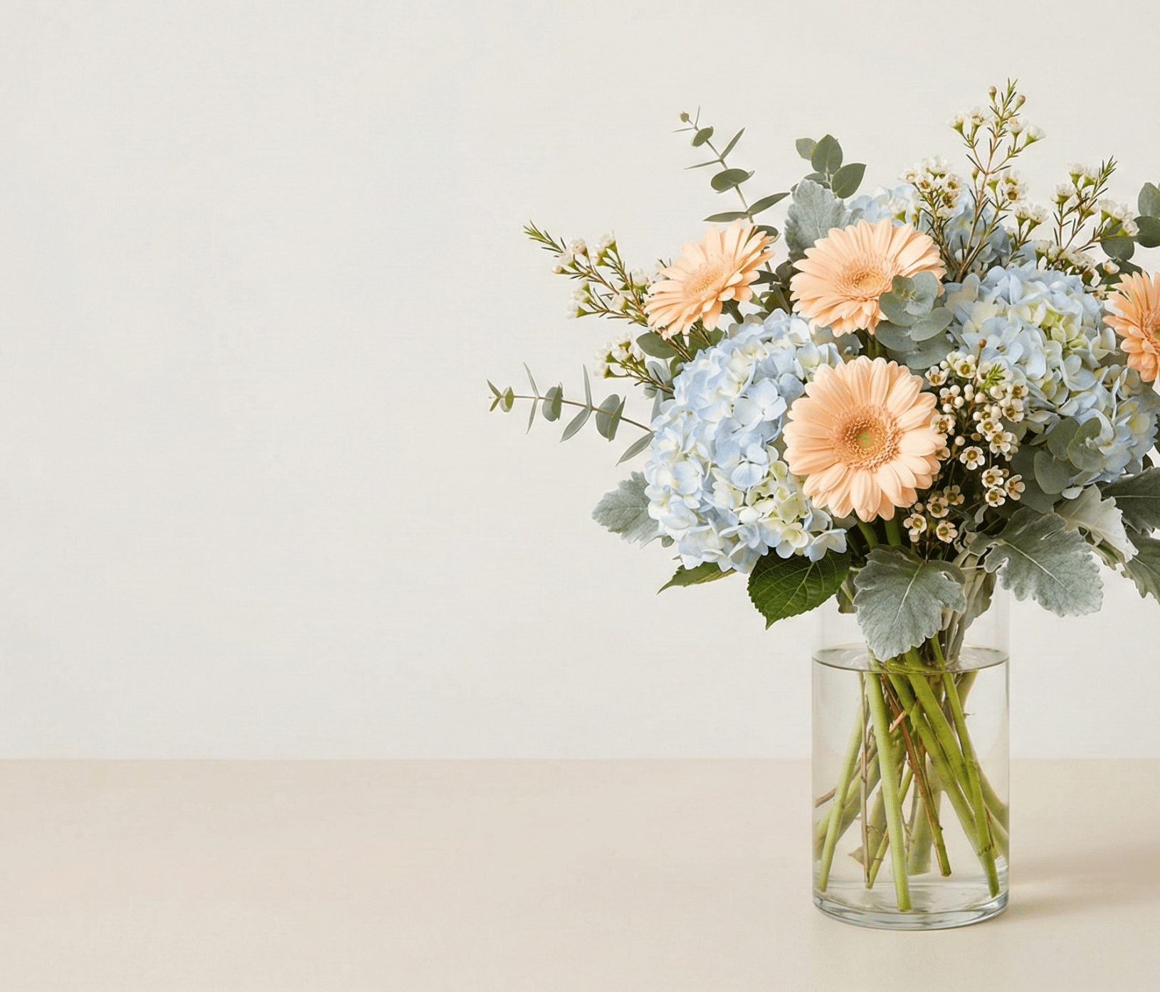 Warmth meets cool tones in perfect harmony. Spring Horizon pairs the cheerful energy of soft peach gerberas with the calming presence of pastel blue hydrangeas and waxflower. It is a vibrant yet soft palette that signals new beginnings.